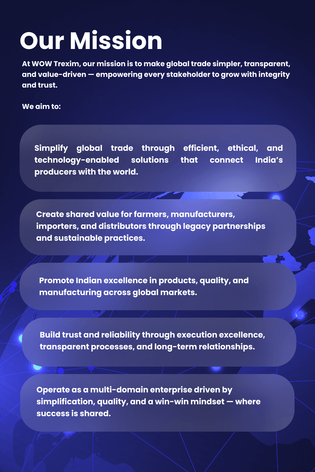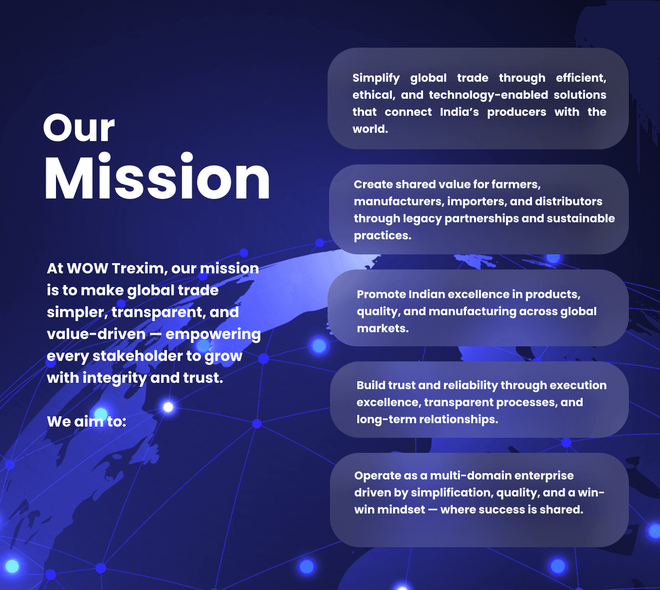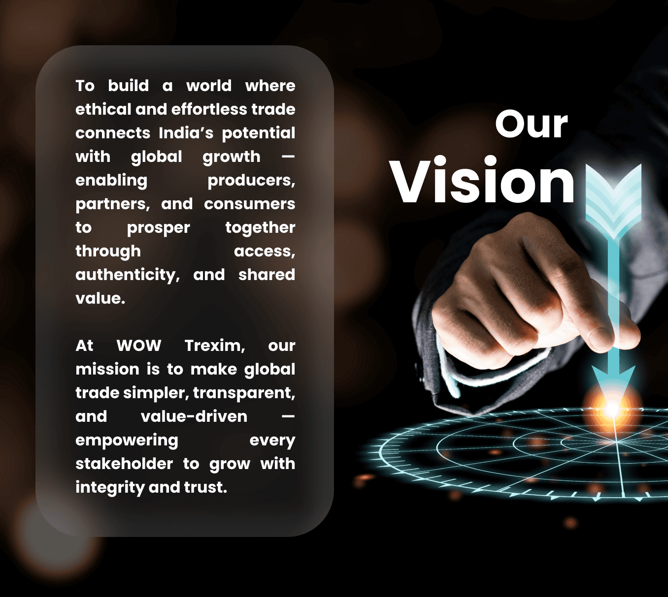 By connecting India's manufacturing excellence and produce with global opportunities, WOW Trexim continues to redefine global commerce - with efficiency, excellence , ethics, and a commitment to shared growth and abundance.